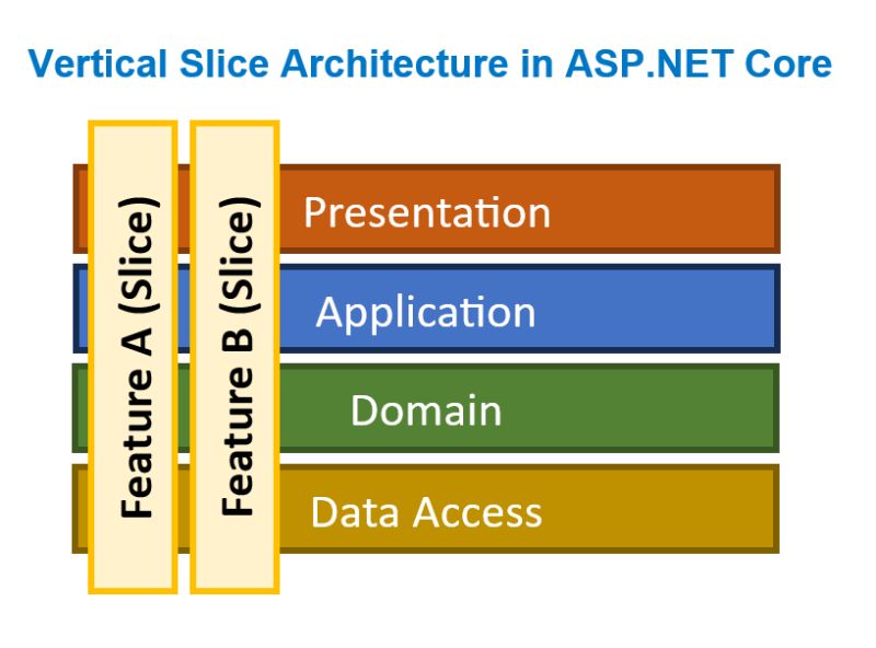در معماری لایه ای هدف این است که به لایه های افقی فکر کنیم، اما در معماری عمودی باید به لایه های عمودی فکر کنیم، در این مورد باید همه چیز را به عنوان یک ویژگی قرار دهیم، یعنی نیازی به لایه های مشترک مانند repositories, services, infrastructure, و حتی controllers نداریم و فقط باید روی ویژگی ها تمرکز کنیم.